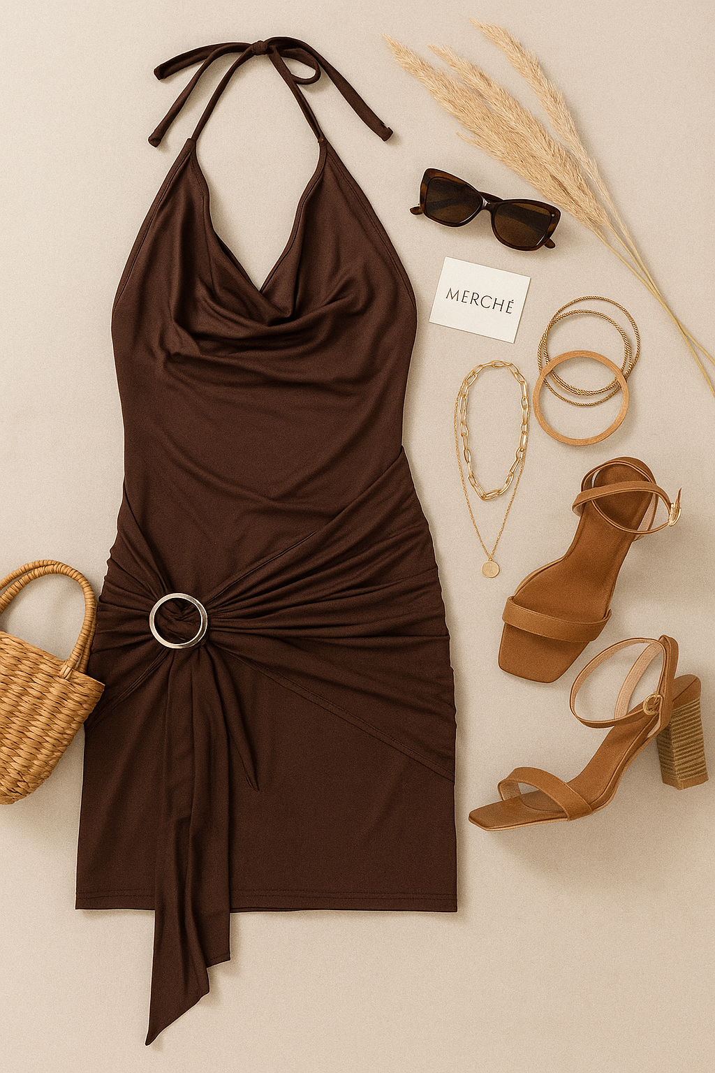 A ribbed knit halterneck mini dress featuring a deep neckline with button-down detail, designed for an easy, body-hugging fit that moves effortlessly from day to night.