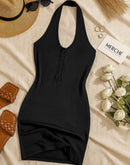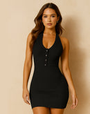 A ribbed knit halterneck mini dress featuring a deep neckline with button-down detail, designed for an easy, body-hugging fit that moves effortlessly from day to night.