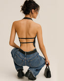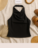 WHISPER NOTES BLACK BACKLESS COWL LUXE SATIN TOP