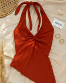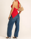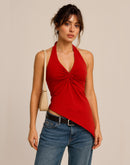 WHY STRESS TWISTED ASYMMETRICAL RED HALTERNECK TOP