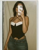 COMMAND THEM PINSTRIPE LUXE CORSETED HALTERNECK TOP
