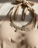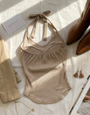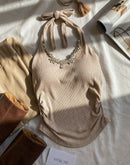 BISTRO LOVER DIAMOND EMBELLISHED PADDED TAUPE HALTERNECK TOP