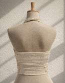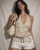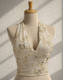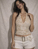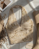 FUEL MY SASS EMBROIDERED BEIGE HALTERNECK TOP