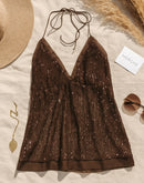 SERVING HOT BROWN SEQUIN EMBELLISHED HALTERNECK TOP
