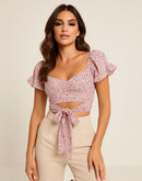 A romantic floral cropped top that’s equal parts playful and polished. Designed with puff sleeves, a flattering ruched bust, and a statement tie-up detail at the waist, this piece is made for everything from coffee runs to golden hour plans. Pair it with denim shorts for a breezy daytime look or dress it up with high-waisted trousers for sunset soirées.