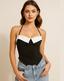 COMMAND THEM PINSTRIPE LUXE CORSETED HALTERNECK TOP