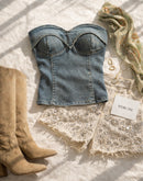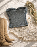 CINEMATIC TRIP PADDED BLUE DENIM BANDEAU TOP