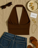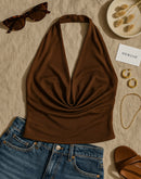 SLAY BELLE BROWN COWL HALTERNECK TOP
