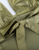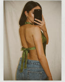 DAWN ON ME OLIVE LUXE SATIN BOW-BACK HALTERNECK TOP