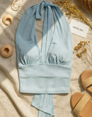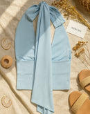 PAST LIFE BLUE LUXE DRAMA STRAPS HALTERNECK TOP