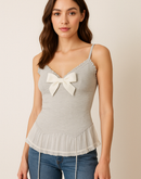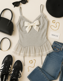 A soft grey cami top with a fitted bodice, featuring a delicate ivory bow at the bust, ruffled trim along the neckline, and a flouncy sheer mesh peplum hem. Casual yet feminine, it’s the perfect blend of comfy and coquette.
