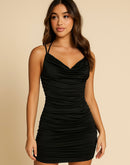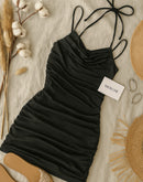 SO FLY RUCHED BLACK HALTERNECK DRESS