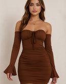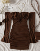 SUNSET MEMORY BROWN SLASH NECK DRESS